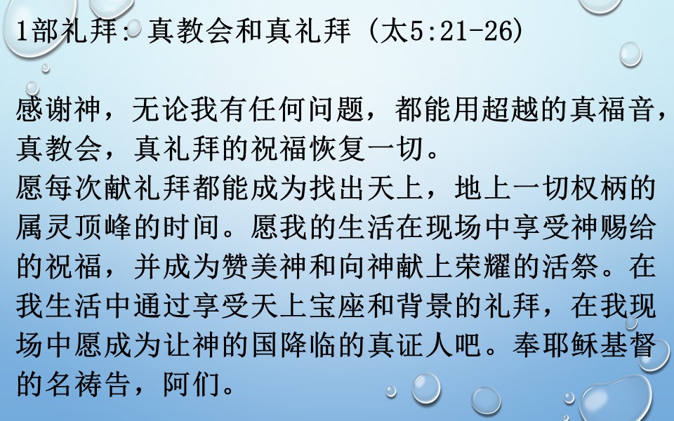 愿每次献礼拜都能成为找出天上,地上一切权柄的属灵顶峰的时间。愿我的生活在现场中享受神赐给的祝福,并成为赞美神和向神献上荣耀的活祭。在我生活中通过享受天上宝座和背景的礼拜,在我现场中愿成为让神的国降临的真证人吧。奉耶稣基督的名祷告,阿们。