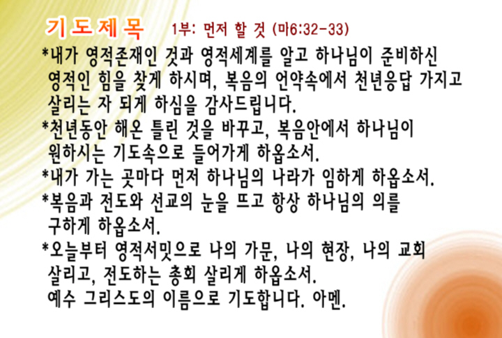 천년동안 해온 틀린 것을 바꾸고, 복음안에서 하나님이 원하시는 기도속으로 들어가게 하옵소서. 내가 가는 곳마다 먼저 하나님의 나라가 임하게 하옵소서. 복음과 전도와 선교의 눈을 뜨고 항상 하나님의 의를 구하게 하옵소서. 오늘부터 영적서밋으로 나의 가문, 나의 현장, 나의 교회 살리고, 전도하는 총회 살리게 하옵소서.
