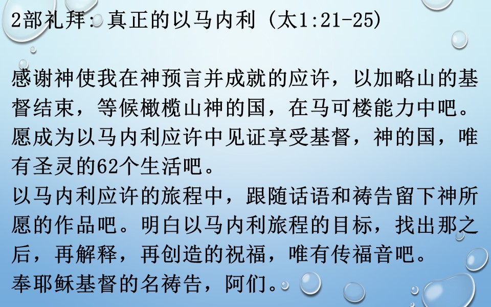 感谢神使我在神预言并成就的应许,以加略山的基督结束,等候橄榄山神的国,在马可楼能力中吧。