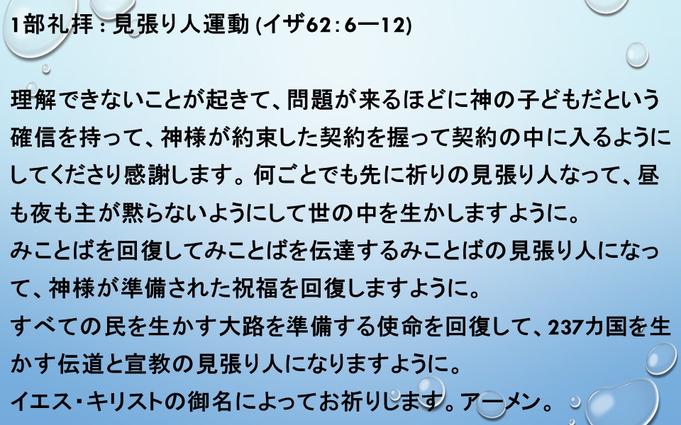 1部礼拝 : 見張り人運動 (イザ62:6ー12)