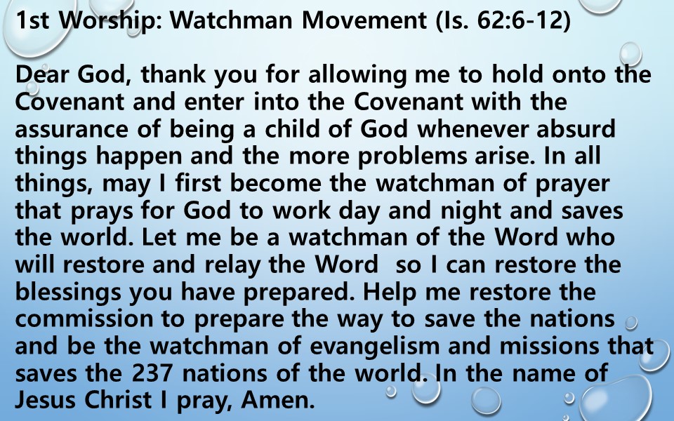 Dear God, thank you for allowing me to hold onto the Covenant and enter into the Covenant with the assurance of being a child of God whenever absurd things happen and the more problems arise. In all things, may I first become the watchman of prayer that prays for God to work day and night and saves the world. Let me be a watchman of the Word who will restore and relay the Word  so I can restore the blessings you have prepared. Help me restore the commission to prepare the way to save the nations and be the watchman of evangelism and missions that saves the 237 nations of the world. In the name of Jesus Christ I pray, Amen.