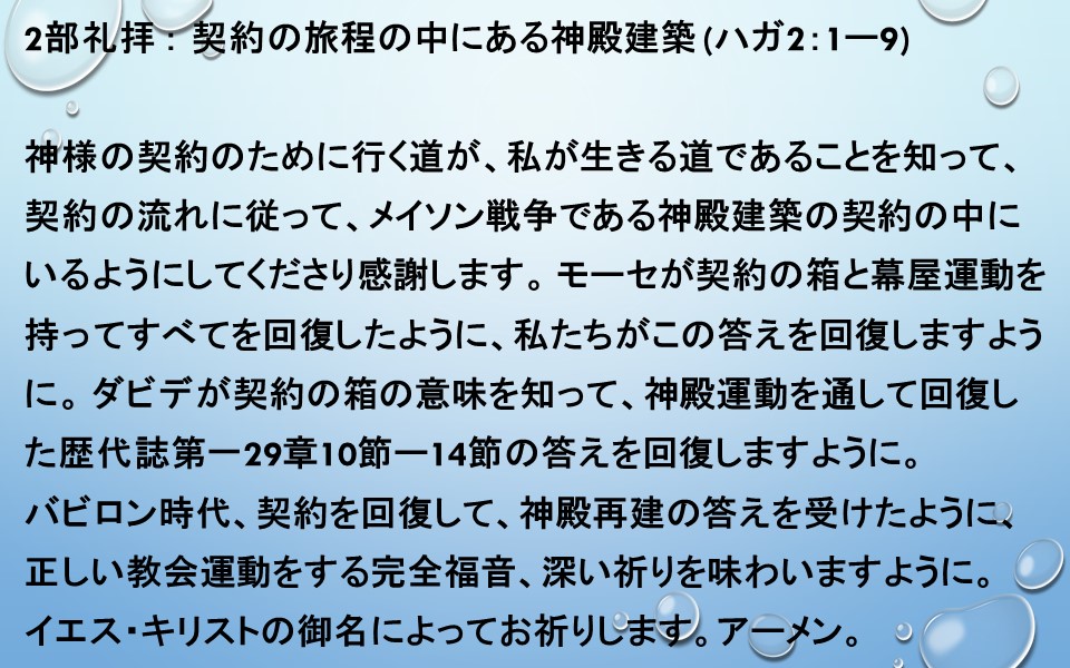 2部礼拝 : 契約の旅程の中にある神殿建築 (ハガ2:1ー9)