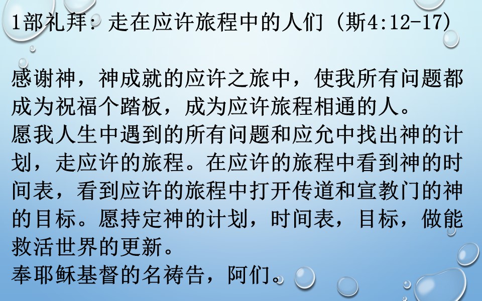 愿我人生中遇到的所有问题和应允中找出神的计划,走应许的旅程。在应许的旅程中看到神的时间表,看到应许的旅程中打开传道和宣教门的神的目标。愿持定神的计划,时间表,目标,做能救活世界的更新。