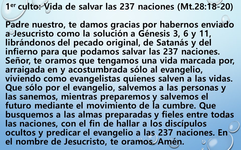 | 1er culto: Vida de salvar las 237 naciones (Mt.28:18-20) |