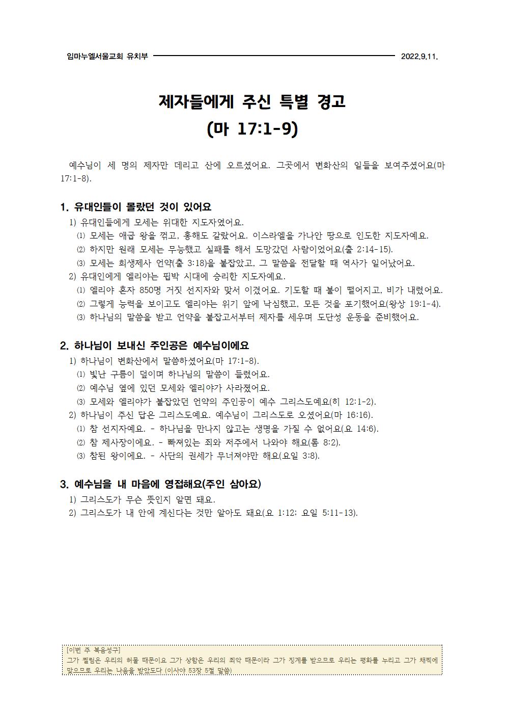 20220911 제자들에게 주신 특별 경고(마 17:1-9)