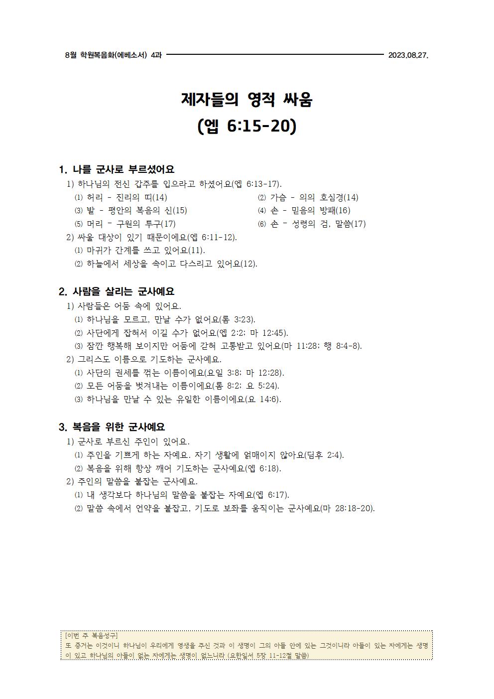20230827 제자들의 영적 싸움(엡 6:15-20)